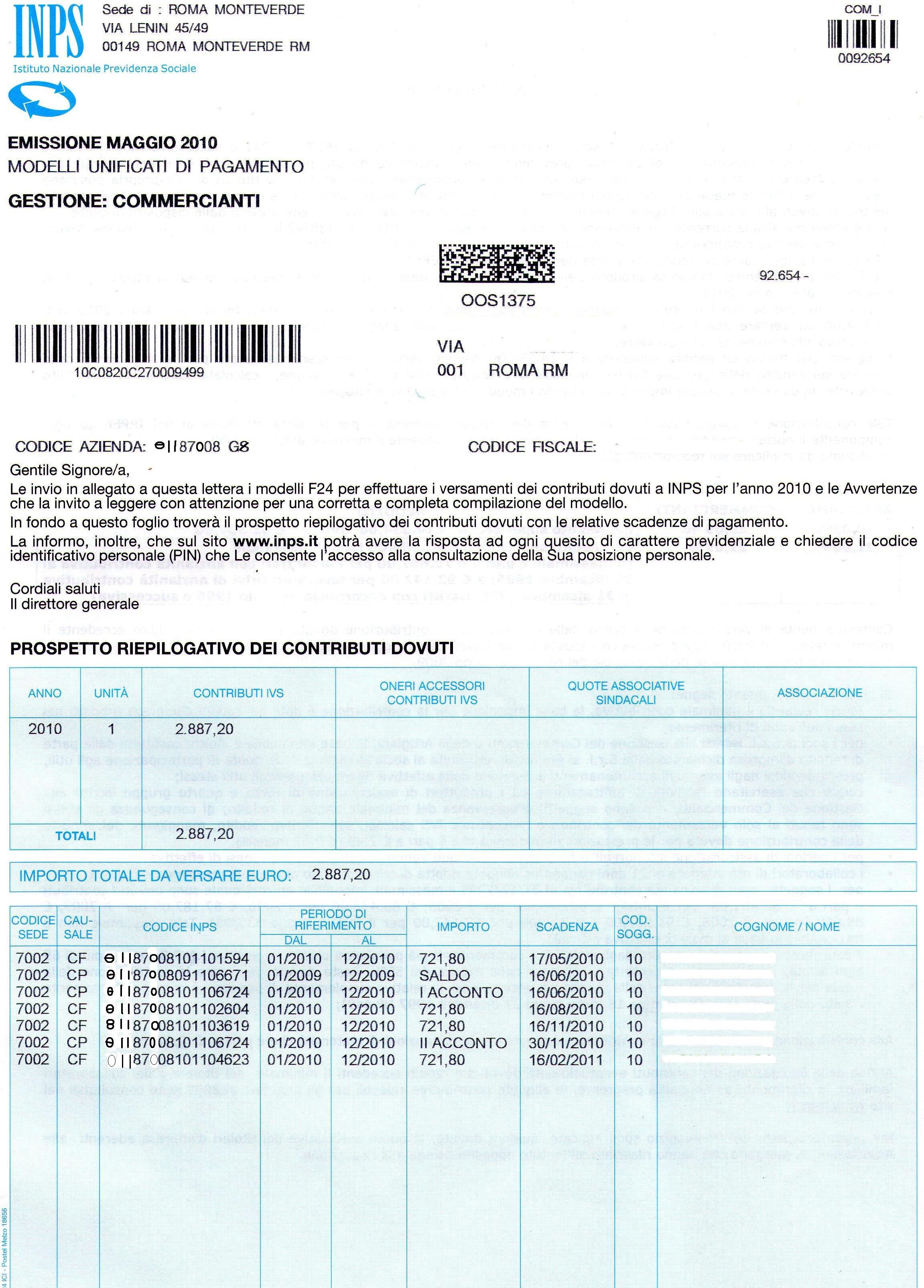 indicando la matricola INPS, la scadenza, l’importo da versare (721,80 se ditta individuale, il doppio se in Impresa familiare) il codice 10 per i titolari ed il periodo di competenza. Detta codeline sarà poi trascritta sul modello di pagamento F24 nella Sezione INPS.